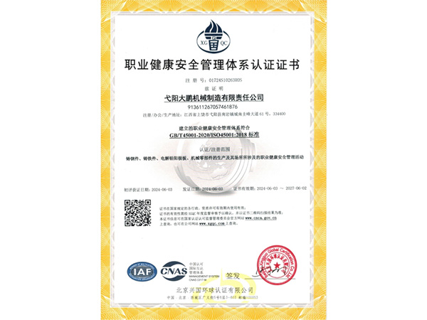 公司順利通過質(zhì)量管理體系認(rèn)證、環(huán)境體系認(rèn)證、職業(yè)健康安全管理體系認(rèn)證、環(huán)評(píng)。2015年5月獲國(guó)家工信委頒發(fā)的《鑄造企業(yè)準(zhǔn)入條件》;2019年做了安全現(xiàn)狀評(píng)價(jià);2020年取得了排污許可證。